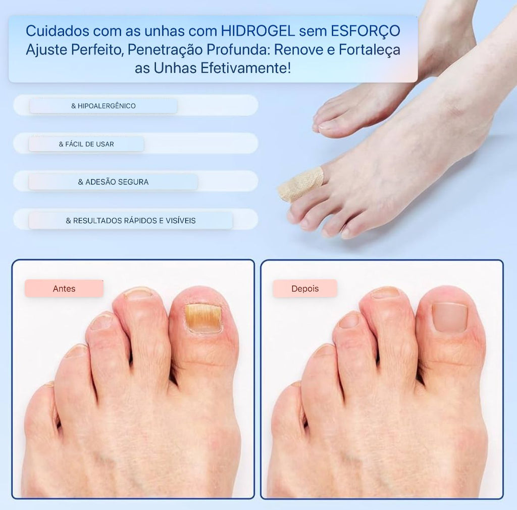 Tecnologia avançada de penetração de hidro gel. Estes adesivos para unhas dos pés utilizam tecnologia avançada de hidro gel para aderir perfeitamente e penetrar profundamente nas unhas, auxiliando no reparo e mantendo unhas mais saudáveis.