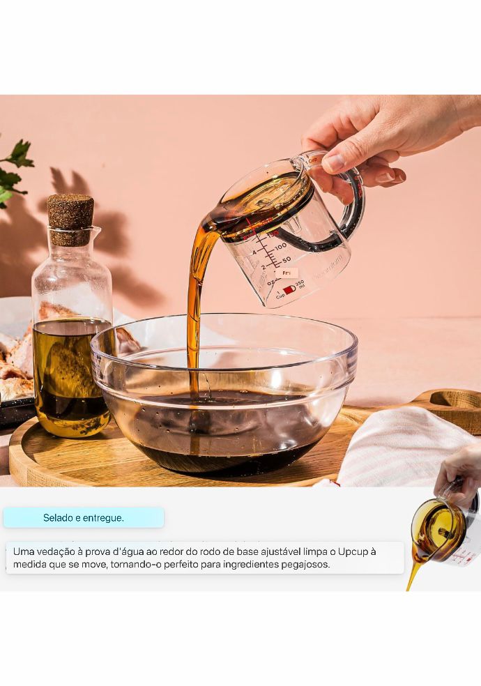 Características: Base raspadora ajustável, marcadores de medição duplos (mililitros e onças líquidas), lavável na máquina de lavar louça, fácil de limpar, economia de espaço, multifuncional.